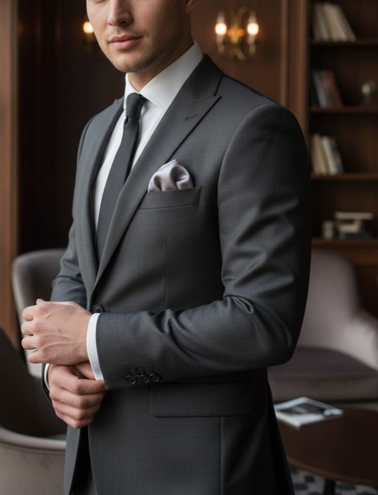 A structured silk-blend pocket square in a refined silver-grey tone, characterised by a composed finish and restrained sheen. Finished with hand-rolled edges, it holds its shape with intention, offering a precise, architectural accent to tailored looks defined by quiet authority.