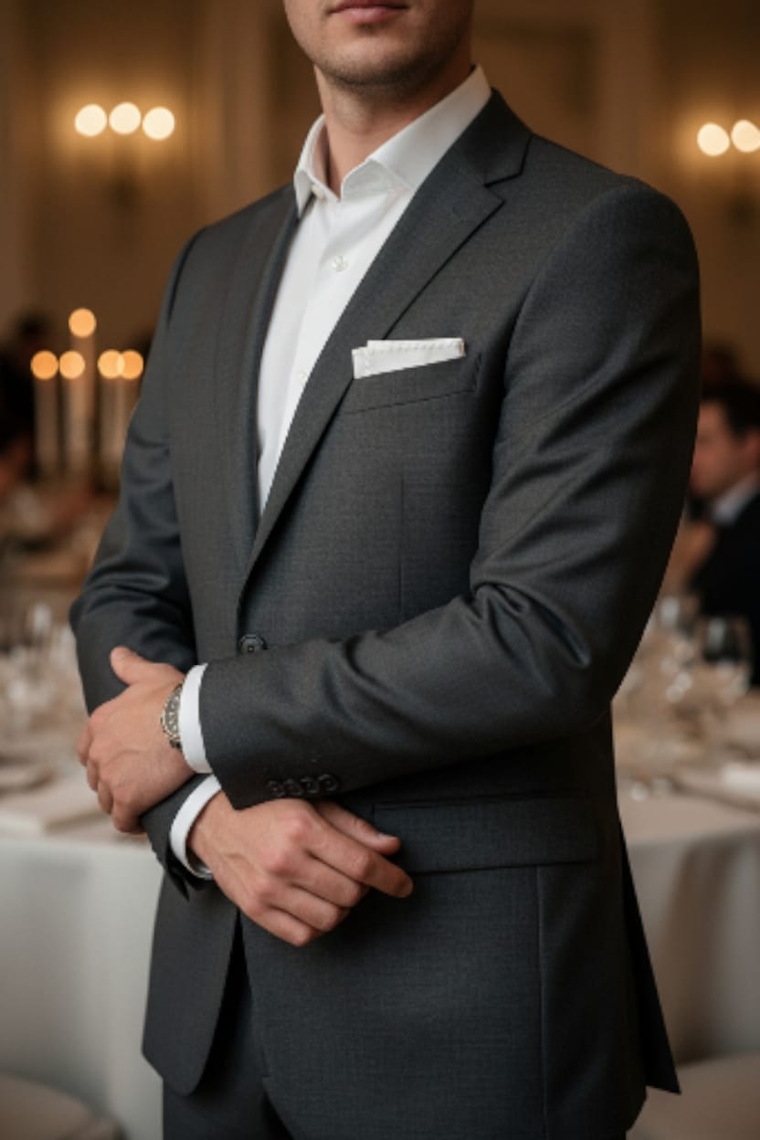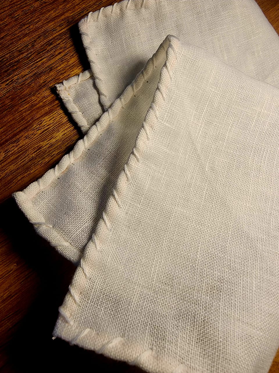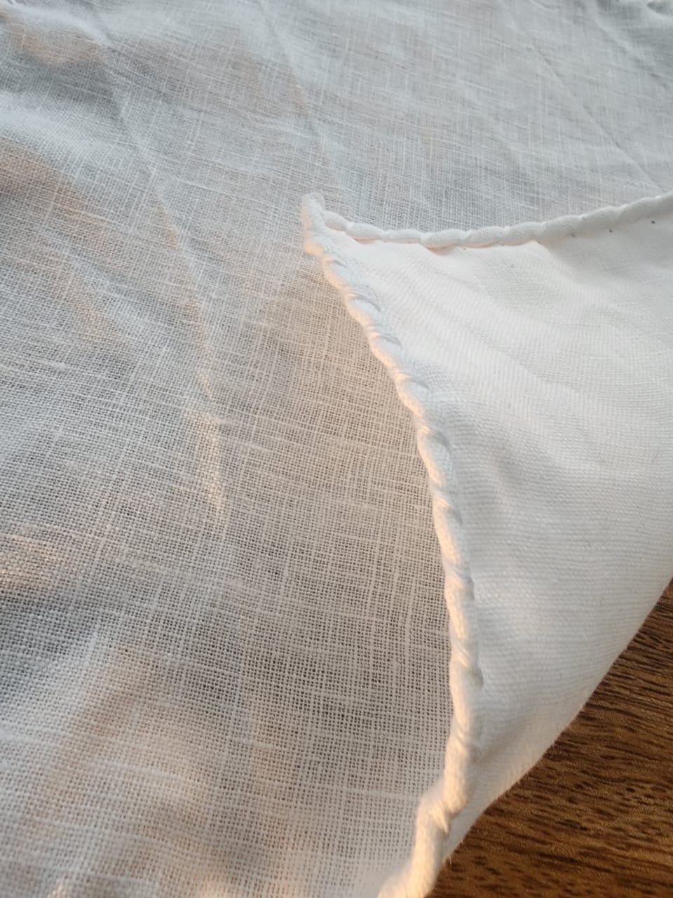 A white linen pocket square finished with discreetly hand-rolled edges, accented by subtle white detailing that blends seamlessly into the fabric. Clean and composed in appearance, it is designed to hold a precise presidential fold—sharp, formal, and enduring.