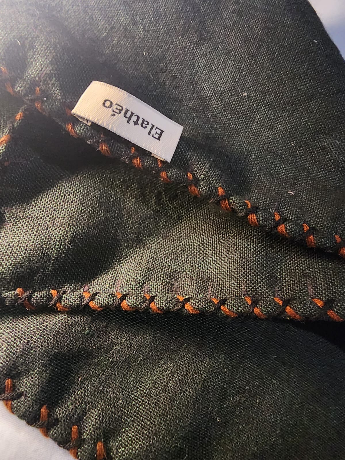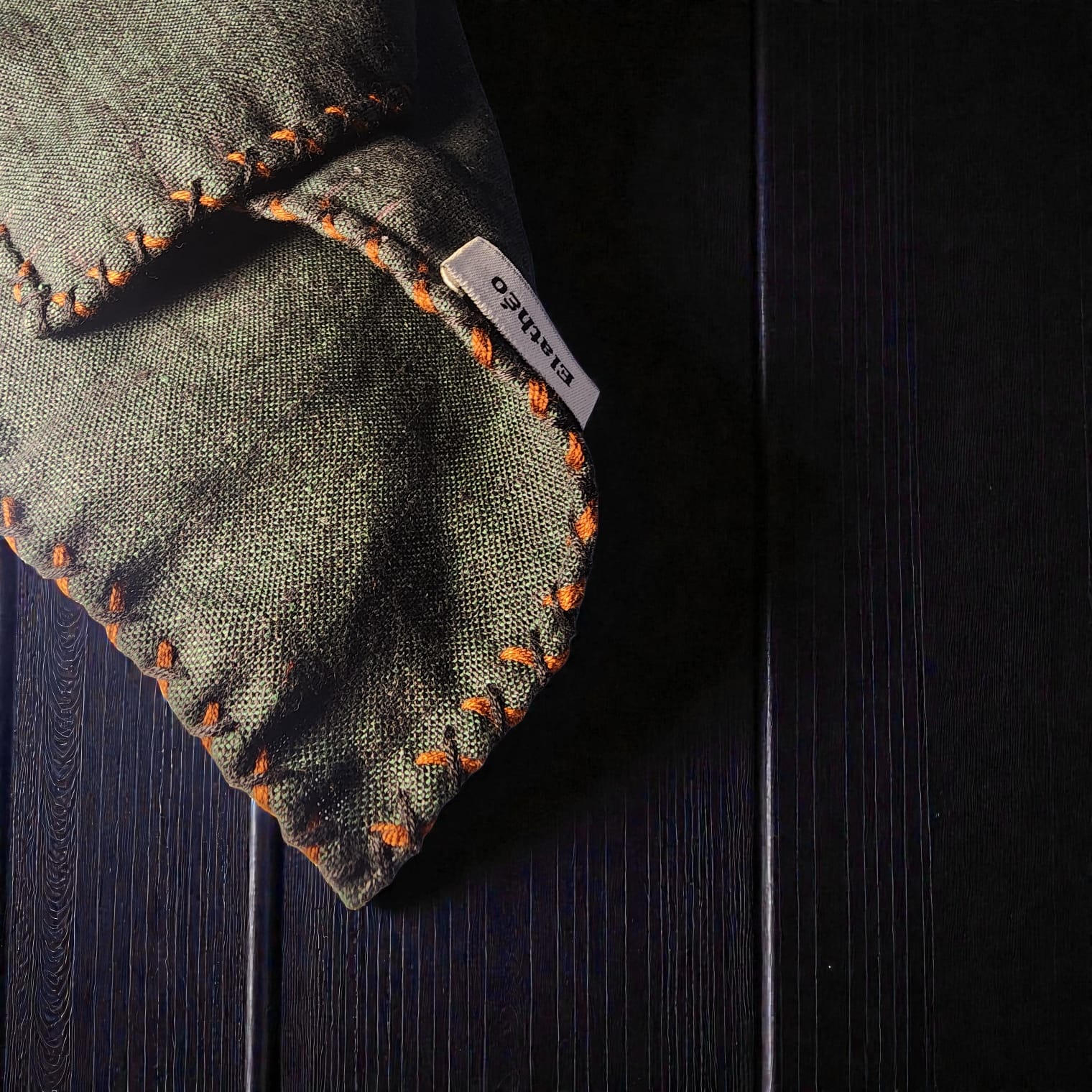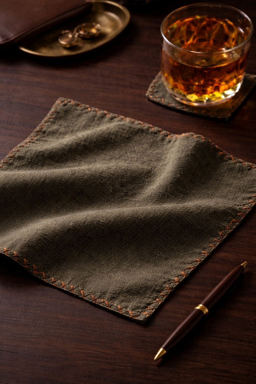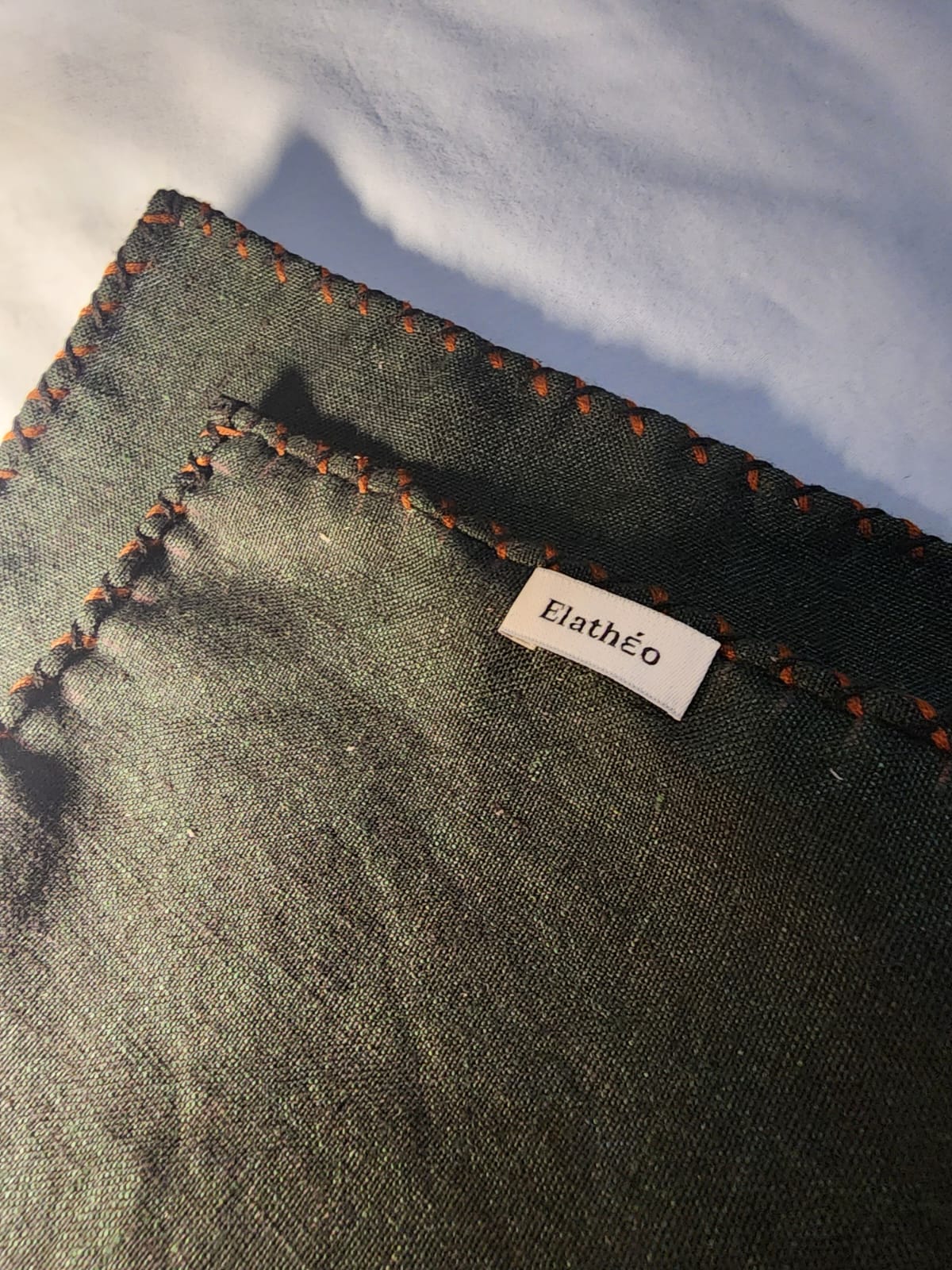 A dual-tone pocket square in deep olive linen, defined by natural texture and quiet depth. Finished with hand-rolled edges and refined detailing in saffron and noir, it offers a grounded, confident accent that favours substance over display.